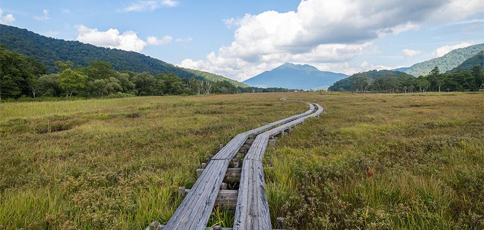 群馬県、福島県、新潟県、栃木県の4県にまたがる尾瀬国立公園。日本有数の広大な高層湿原を擁し、ミズバショウやニッコウキスゲをはじめとする希少な高山植物が生育していることから、国の特別天然記念物に指定されているほか、国際的に重要な湿地を保全し生態系を守るためのラムサール条約湿地にも登録されている。