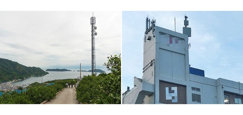 赤丸が金華山灯台、画面左のポールが基地局だ(左)。基地局にはパラボラアンテナも設置(右)