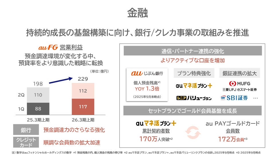 個人の預金残高は昨対比1.3倍と順調です。この調達力を強化するために、プランの特典強化や銀証連携の拡大を進めていきます。クレジットカードは会員数の拡大が急務ですが、ゴールドカードについては172万会員に到達し、さらに成長させていきます。
