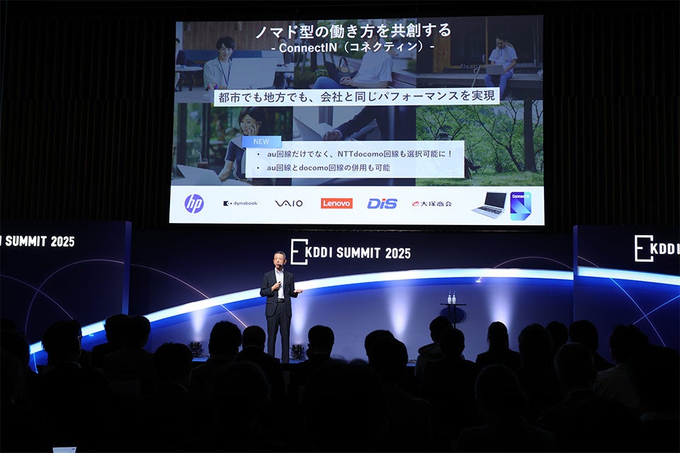 さらに、働き方を支援するものとして、PCと通信を一体化させた「ConnectIN(コネクティン)」という仕組みについて言及。法人向けPCにeSIMを実装し、通信環境を意識せずに働けるノマド型働き方を支援します。au回線だけでなくNTTドコモ回線にも対応しているため、BCP用途で併用も可能です。