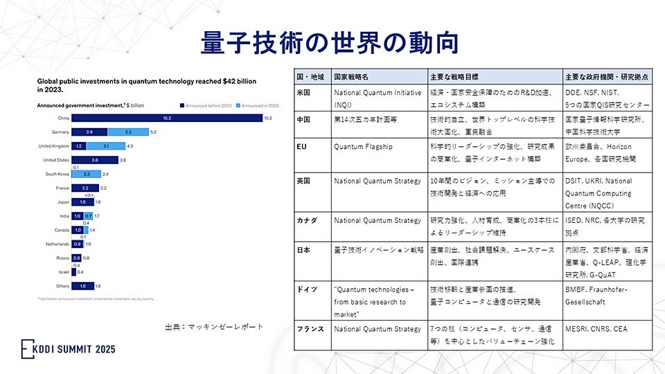 藤井から「AIはLLMで日本が出遅れた印象があるが、量子技術において日本は世界でどのような状況にあるのでしょうか」と問われた山城氏は、各国の政府機関の投資計画を紹介し、日本の強みについて言及しました。