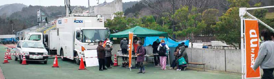 その後、山崎たちは、近隣で被害が大きく避難者が多く、約1週間、携帯電話が使えなくなっていた宮城県女川町総合グラウンドに移動して車載型基地局を設置。