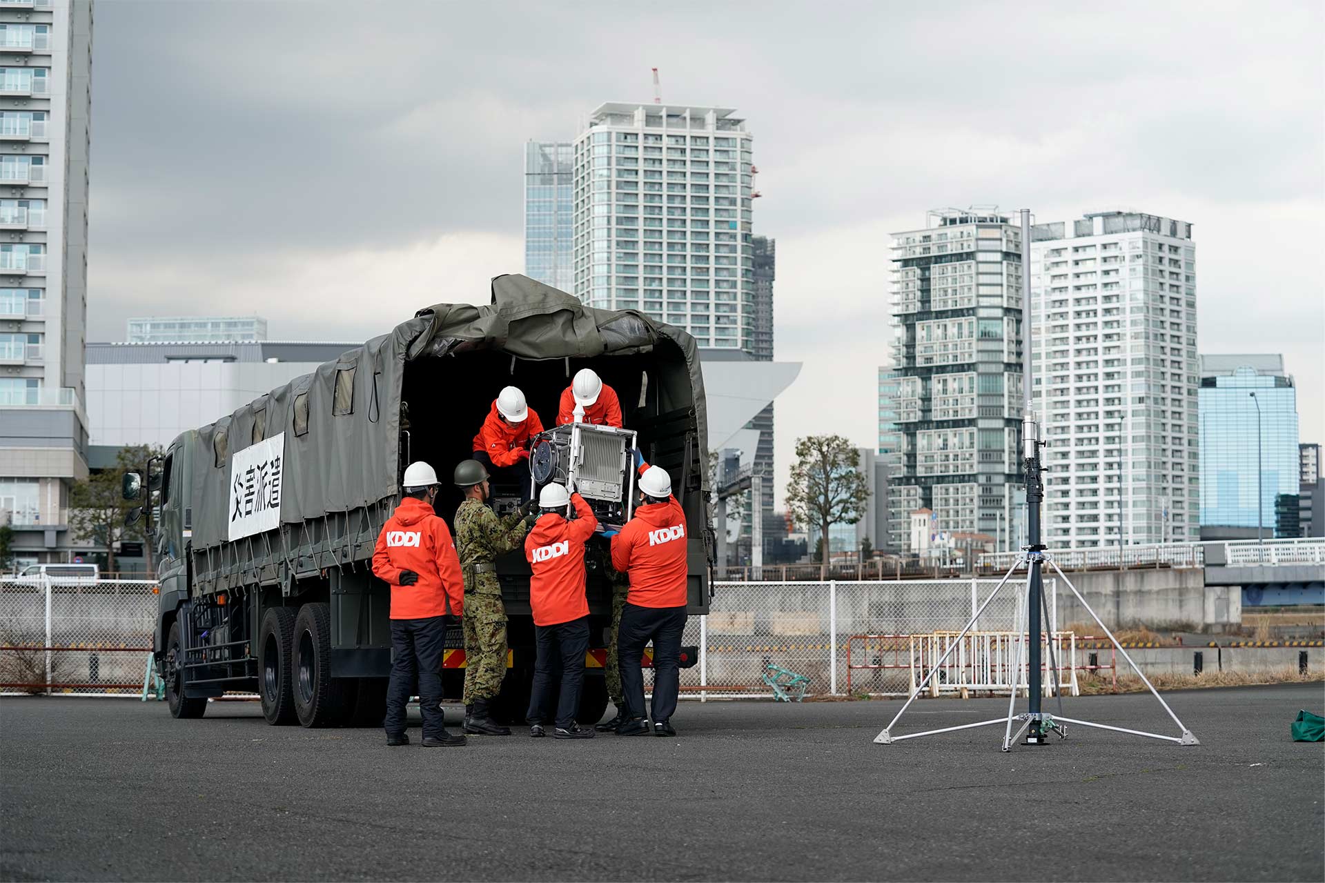 2025年1月24日、神奈川県横浜市のみなとみらい地区でKDDIの「災害対策訓練」が実施されました。実災害を想定し、2年に1度行われる大規模な公開訓練で、自衛隊や国土交通省、海上保安庁、消防などの関係機関とも連携し、通信復旧の初動から実動までを検証するのが特徴です。