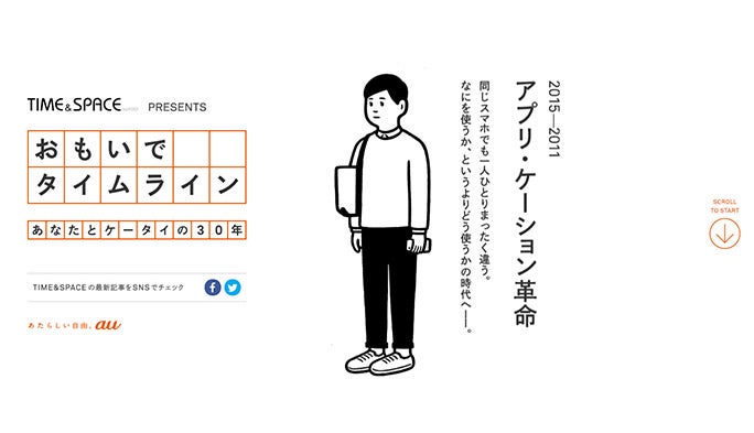 携帯電話30年の歴史は8つの時代に分けられていて、一体どんな時代だったのか、街ではどんなことが流行っていたのか、「TIME & SPACE」でもコンテンツ連動した記事をつくっていく予定です。サイトはタイムラインのように、時代をさかのぼるようなつくりになっていますが、もちろん、いちばん思い入れがある時代からチェックしてみるというのも楽しみ方のひとつかもしれませんね。