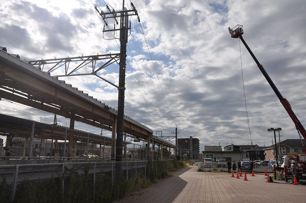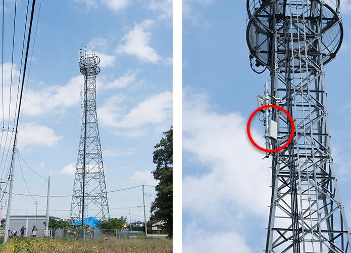 右写真に四角い薄い箱が。そう、これ5Gのアンテナなんです。実験ではほかにもう2本、線路沿いに合計3本のアンテナを設置しました。