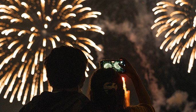 午後7時30分、まさに目の前で花火の打ち上げが始まった。すごい迫力だ。ラヴェルの「ボレロ」、Mr.Childrenの「HANABI」、ビリー・アイリッシュの「BAD GUY」が次々と流れ、演奏のロングトーンと花火玉が空に昇っていくあいだ、ボーカルのシャウトと花火の炸裂が完全にシンクロしていた。そして、多くの観客が空にスマホを向けていた。