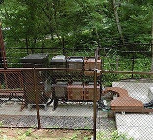 まずは山頂から直線距離で7km離れた山麓にあるau携帯電話基地局「北富士局」のアンテナをチェックする。富士山対策専用の巨大な「高利得アンテナ」が、スバルライン近くの基地局敷地内に設置してある。