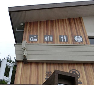 吉田口ルートの登山口である富士スバルライン五合目に到着すると、何軒ものレストランが建ち、ちょっとした街のように賑わう中で、1軒だけやたらたくさんの携帯電話アンテナが付いている建物があった。円盤状やプレート状、筒型など形状は違うが、みなレストランの外壁色に塗られている。確認したら、どうやら円盤状のアンテナをはじめ、いくつかがauのアンテナらしい。そして食堂のレジ脇にauの「ここでもLTEがつながる」ステッカーを発見。測定してみると、下り29.57Mbps、上り15.82Mbpsという速度だった。登山口の総合管理センター前で「富士山保全協力金」1,000円を支払い、いざアンテナ見学の山登りへGO! だ。