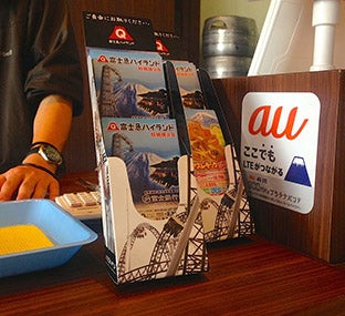 このような山小屋前で、休憩しながらスマホやケータイで写真を撮る人は多い。山小屋にも、auの「ここでもLTEがつながる」ステッカーが貼ってあり、同行の方は、仕事の電話を普通に受けていた。まさか電話の相手は富士山登山の最中とは思うまい。それも、通信状態が街中と変わらないおかげだ。登山道の途中で何度が通信速度を計測したが、そこそこのスピードが確保されていた。この高速の通信環境なら、スマホとパソコンさえあれば、富士山でも仕事ができそうだ。