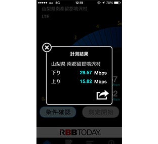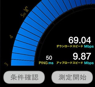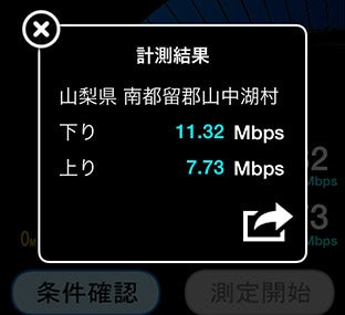 山頂にある山小屋に入って通信速度を計測してみると、混雑している時間帯にもかかわらず、下り70Mbps近くの数値が出た。まぐれではなく、何度も同程度の数字が測定されたので、安定してこの速度が出ているということだろう。