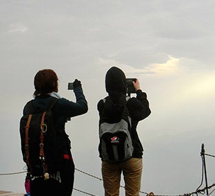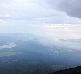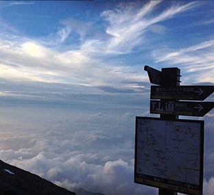 翌日早朝(というよりは深夜)に、山頂を目指して再び登山開始。山頂に到着すると、既にあたりはご来光を待つ人の波。今回は残念ながら曇り空でご来光を見ることはできなかったが、それでも山頂から眺める景色は雄大で、素晴らしい眺望だ。スマートフォンやタブレットで撮影している人も多い。この夏、何人もの知り合いが富士登山をしているが、ご来光の写真や仲間との様子をほぼリアルタイムでSNSにアップする人も多い。見ている側としても、体験を共有する感覚が増すのでリアルタイム投稿は楽しい。