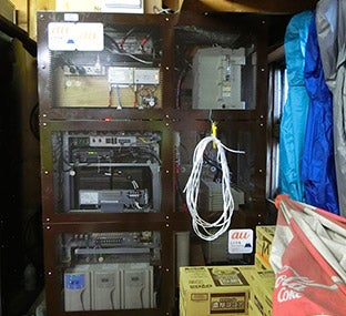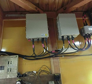静岡県側では、山梨県側のように、富士山専用アンテナのような大きなアンテナでカバーというやり方はしていない。登山道にある山小屋を中継地点として電波を増幅してつないでいるのである。富士山の登山道の山小屋のほとんどにあたる二十数カ所に、auのレピーターが設置されている。「UDEC2」という高機能移動中継機だ。山小屋の屋根の上には1対になったアンテナが設置されていて、下に向いたアンテナで拾った弱い電波を室内のレピーターで増幅して、上に向いたアンテナでさらに上の山小屋に向けて送り出している。このような方法を採るようになったのはLTEになってからで、3G時代には、山頂にしかエリアを設置していなかった。LTEが普及するにつれて、より広い範囲でスマートフォンを利用したいという要望に応えたものだ。