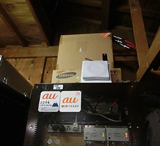 山頂には、富士山専用アンテナによる登山道のエリア化とは別に、山頂エリア専用の基地局を用意している。ここにau初の、800㎒帯と2㎓帯の両方の周波数帯で送受信できる「Dual Band Pico」と呼ばれるピコセル(小型基地局)を設置。これまでのピコセルと同程度のサイズや重さにもかかわらず、両方の周波数帯に対応する。「Dual Band Pico」は山小屋「山口屋」の室内に設置されており、屋根の上に置かれたアンテナにつなげられ、受信最大150Mbpsのエリアを作っている。