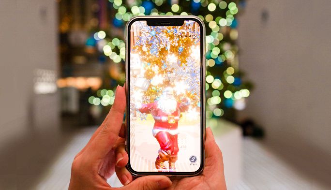 このように自分の目で見ても楽しめるクリスマスツリーだが、今回はさらに仮想現実と組み合わせ、スマホのアプリ「STYLY」を使ってツリーにカメラをかざすと、楽曲にあわせてサンタが踊る演出も楽しめる。
