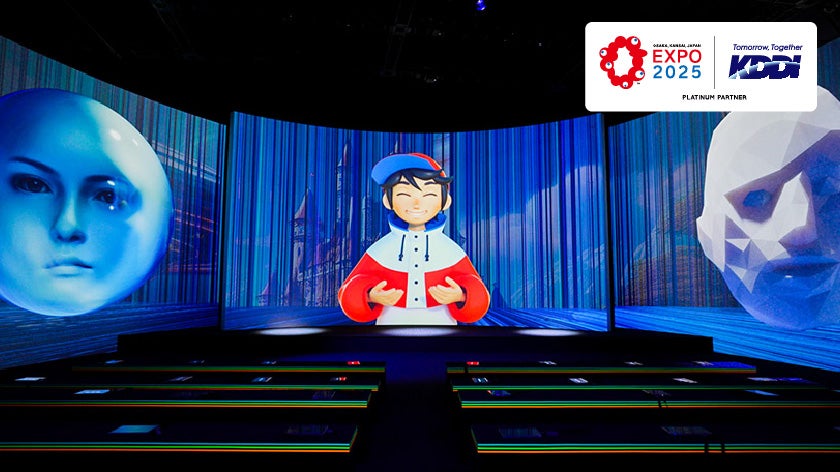 KDDIは、大阪・関西万博「フューチャーライフ万博・未来の都市」のプラチナパートナーとして、「Society 5.0と未来の都市」をテーマに日立製作所と共同展示を行っています。