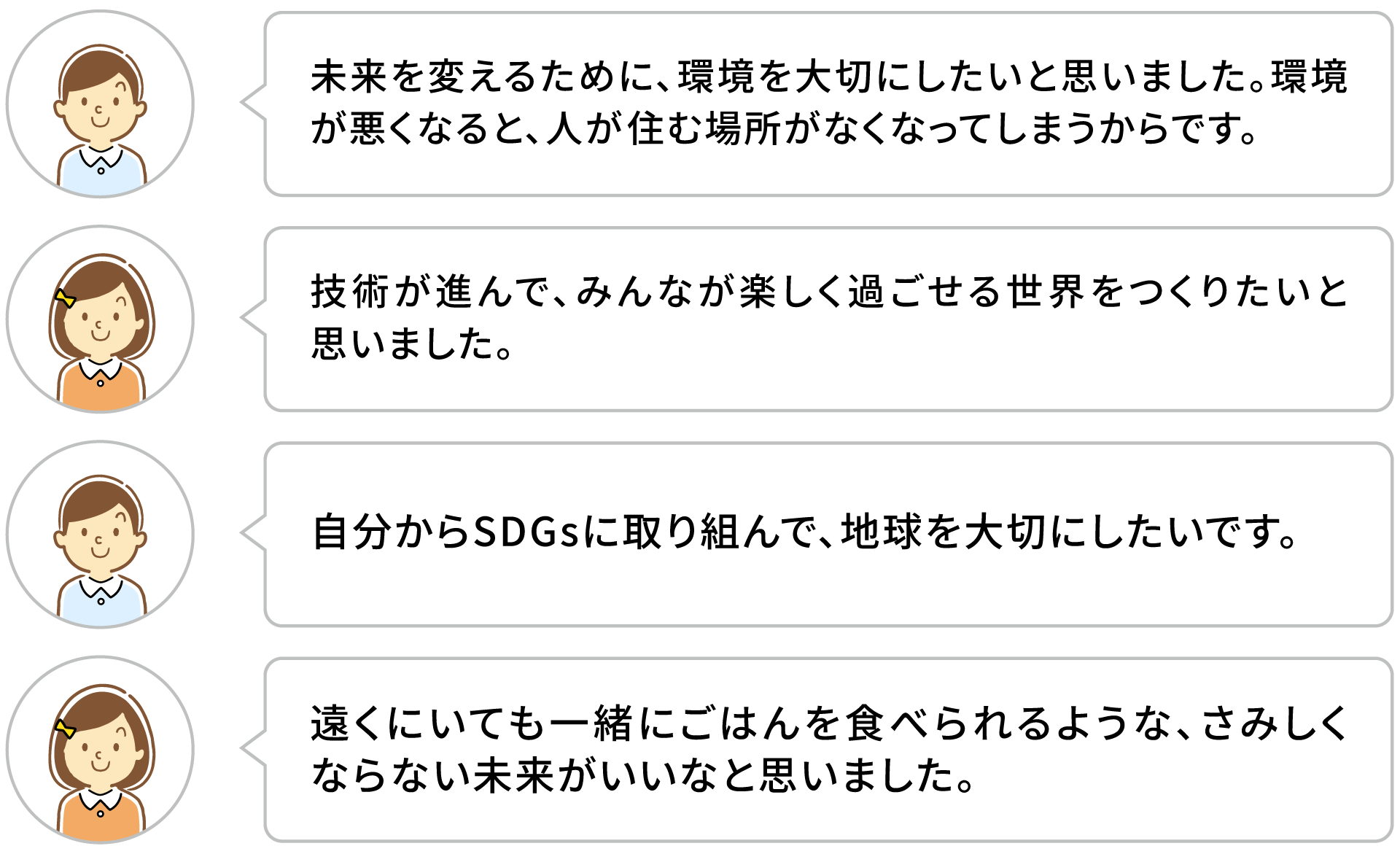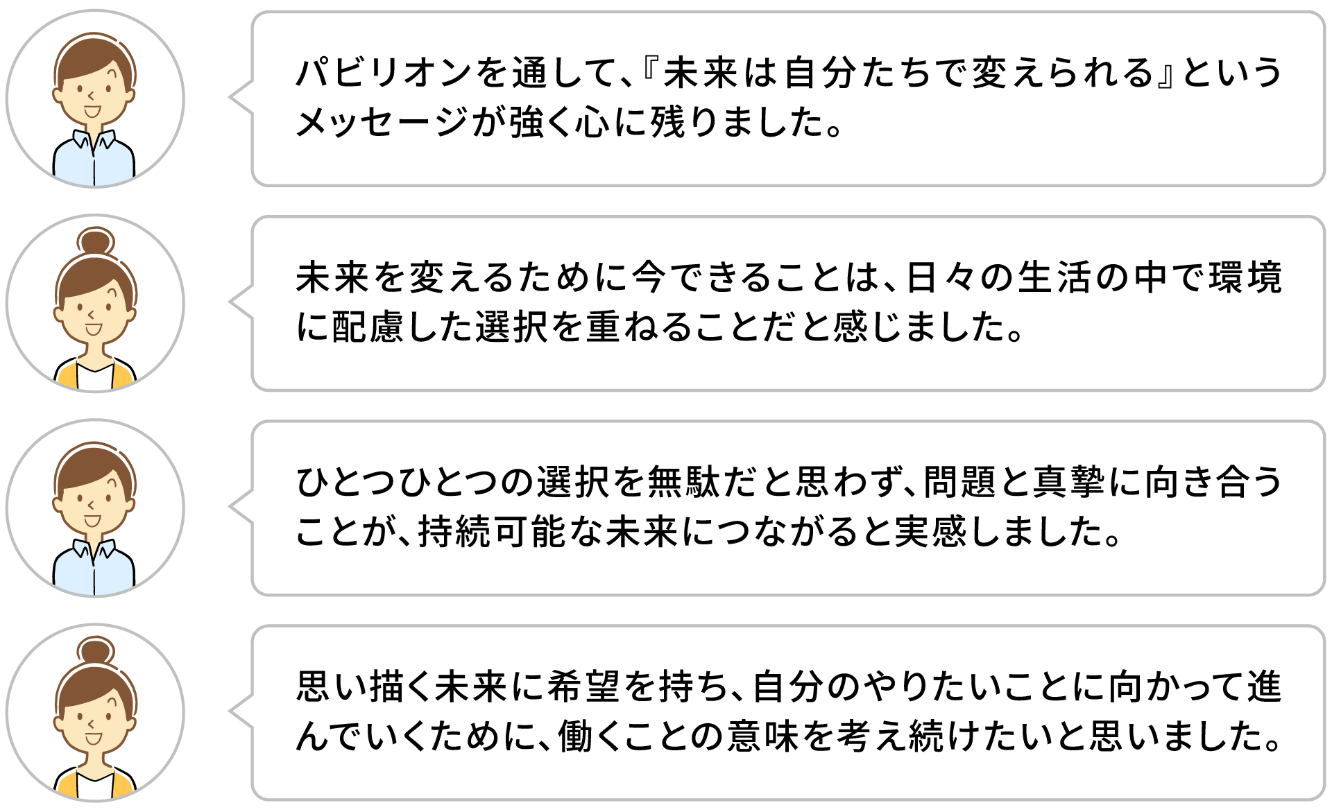 子ども、大学生、内定者、株主、そして共創パートナーなど、それぞれの立場で参加した人たちが、「Mirai Meeting」での体験を通して、どんな未来を考えたのか、いくつかの場面を紹介します。
