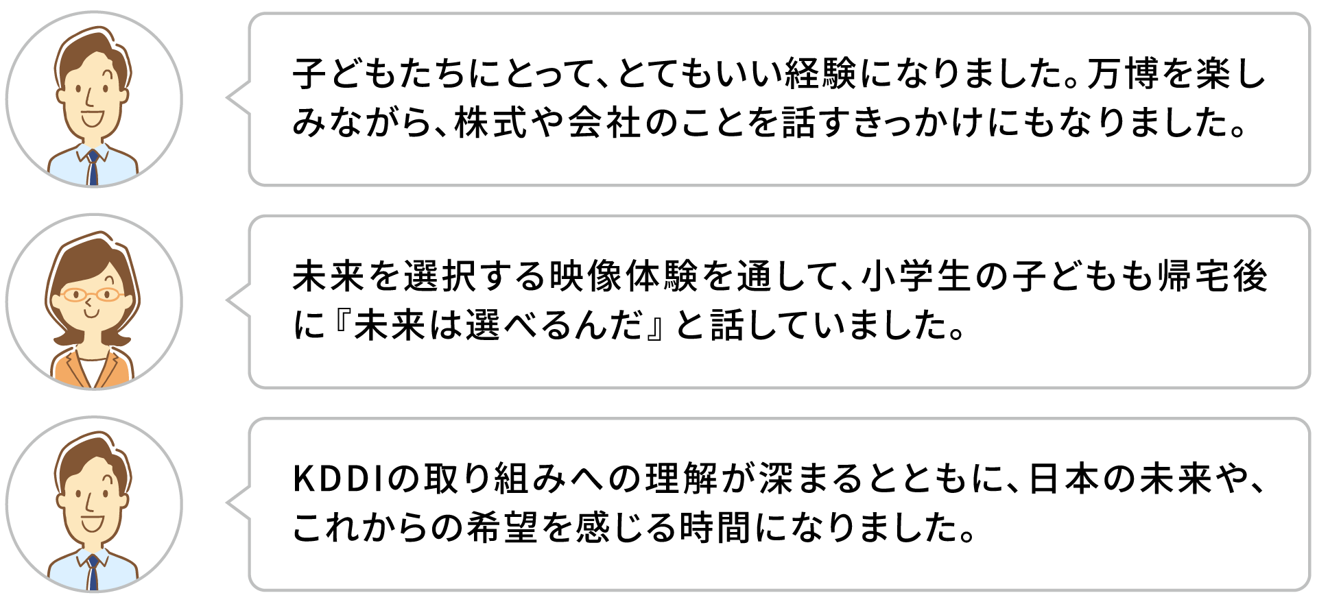 万博は、企業の取り組みを一方的に伝える場ではなく、世代を超えて未来について語り合う時間を生み出していました。家族とともに体験し、語り合うなかで、KDDIがどんな未来を目指しているのかを実感として受け取ってもらう。