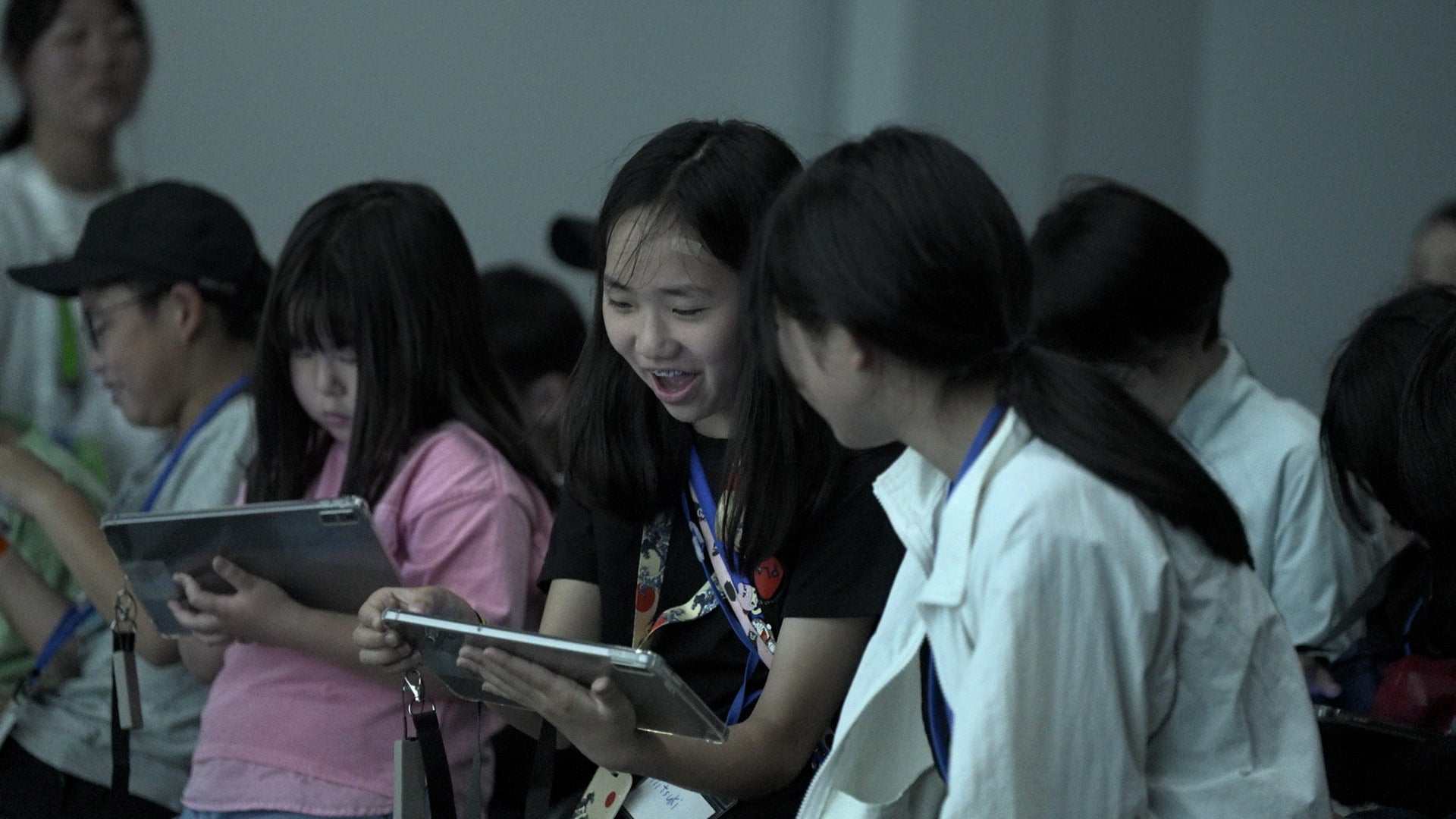 手元のスマートデバイスで未来を選択し、「こっちの未来がいい」と声を上げる子どもや学生たち。