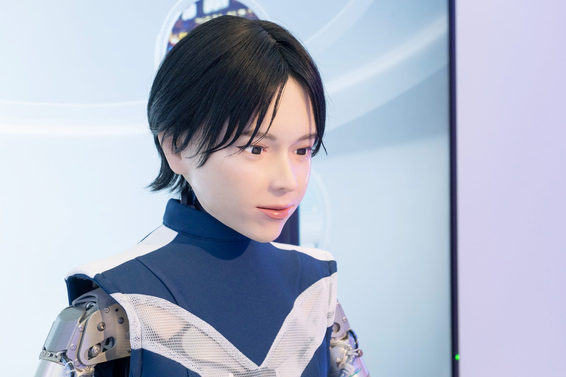 入口で来場者の視線を集めていたのは、人間と見間違えるほど自然な表情としぐさで動くヒューマノイドです。