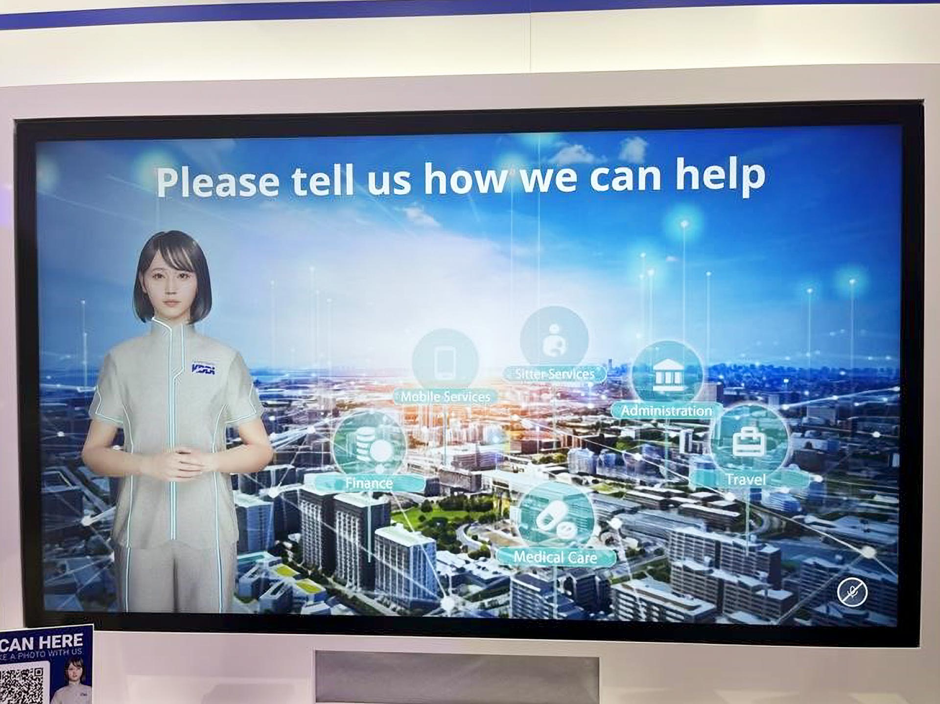 滑らかな音声で話しかけ、観光案内から日々の暮らしの相談まで、来場者一人ひとりの質問に丁寧に答えていきます。