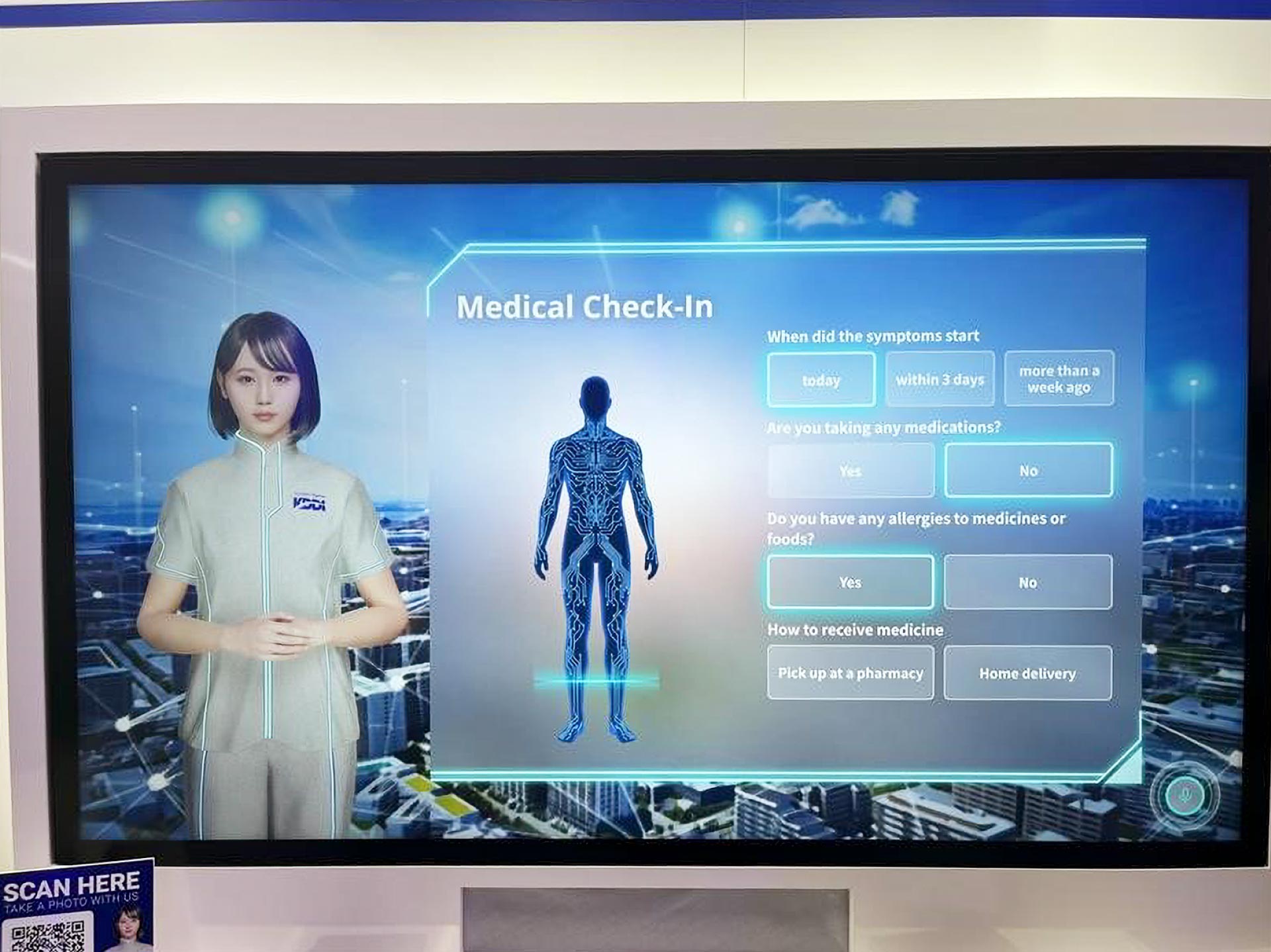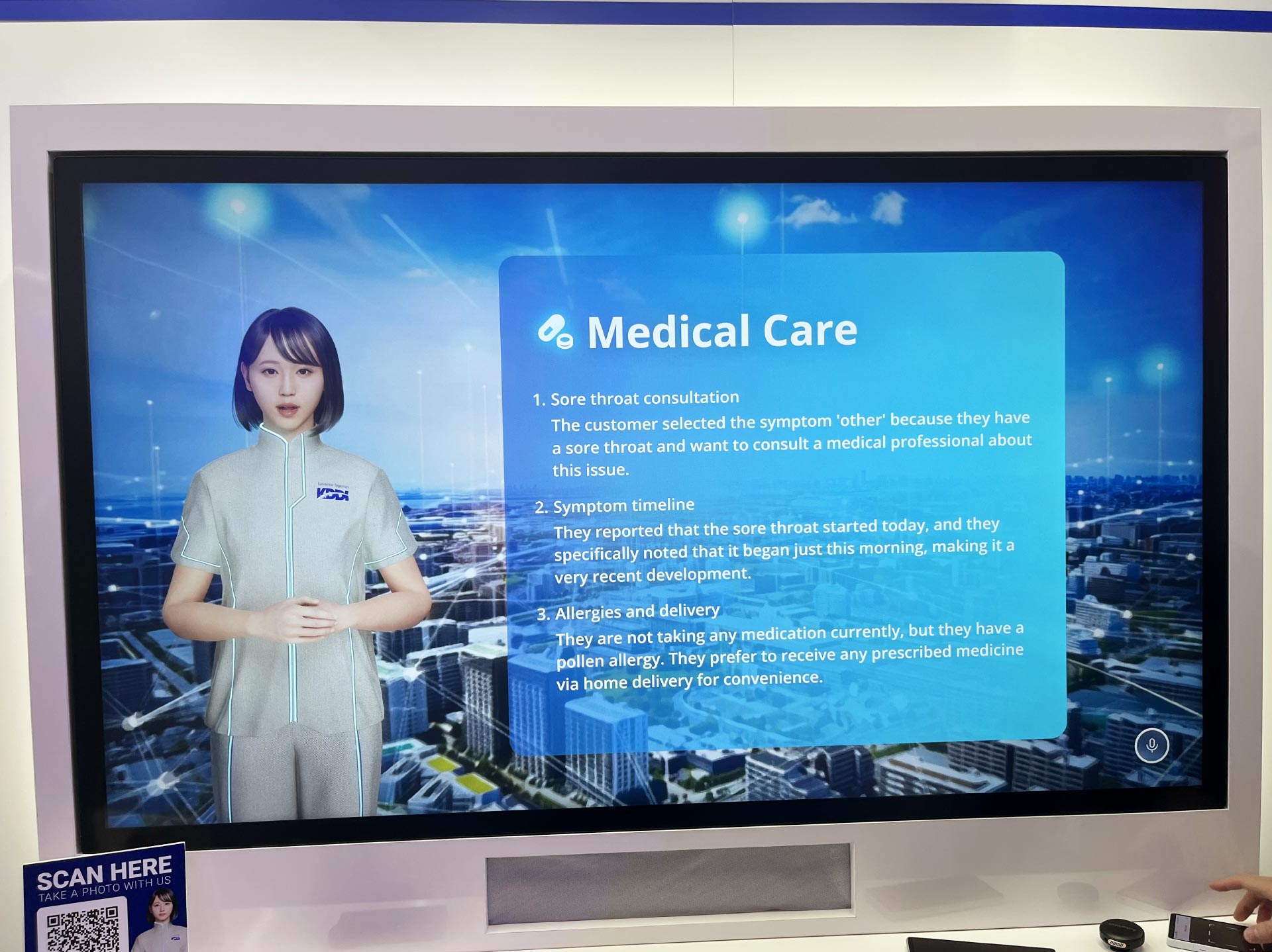 AIアバターによる接客後は医師にビデオ通話が接続され、遠隔でオンライン診療などが受けられ、医師にはAIによる問診内容が引き継がれるので、スムーズな診察が可能です。