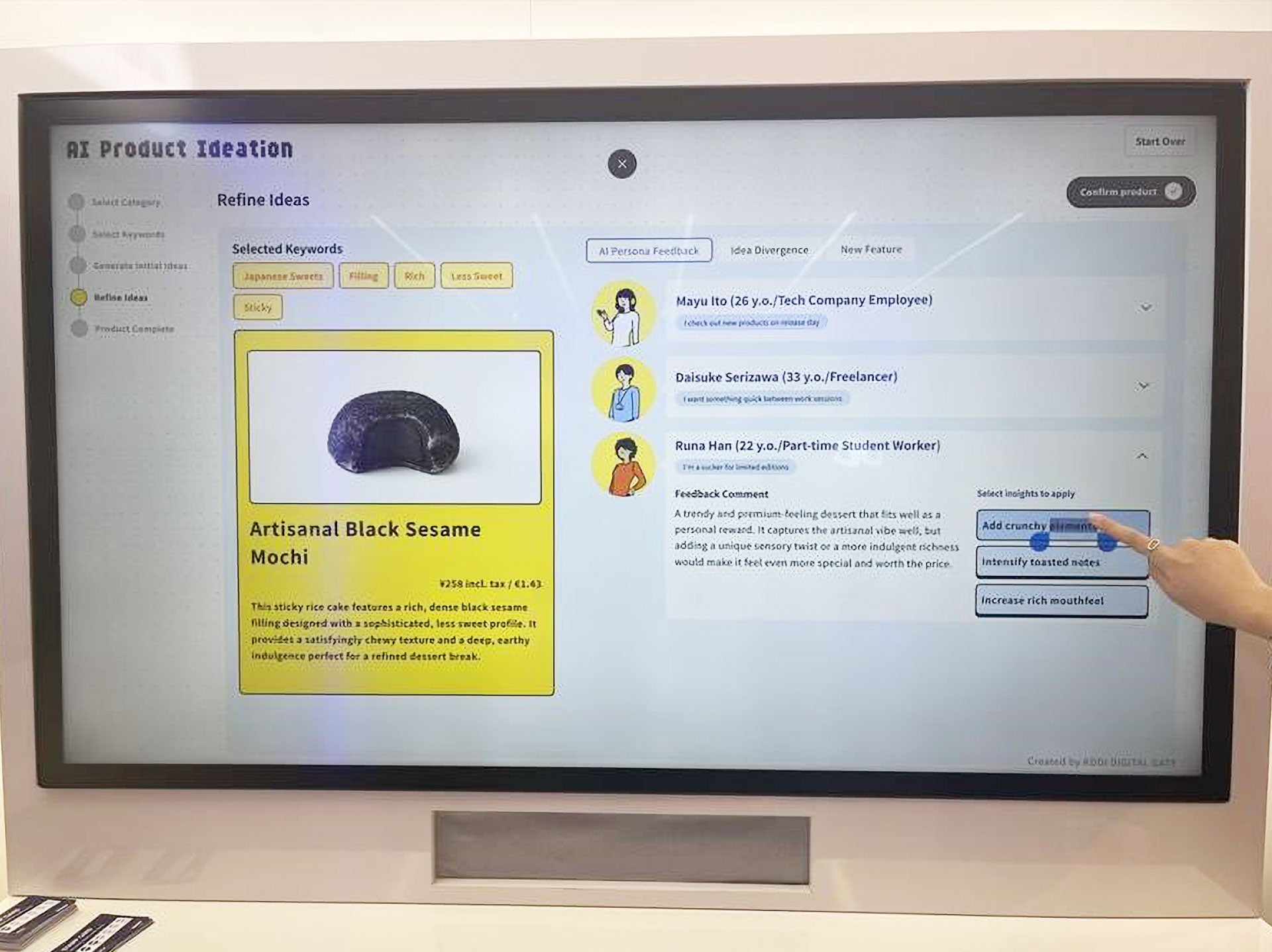 さらに驚いたのは、生成AIがその商品の「お客さま」になりきって客観的に評価してくれる点です。「カリカリした触感を加えてほしい」といった改善コメントをもとに、人とAIが対話しながら企画をより良いものにしていくプロセスを疑似体験できました。