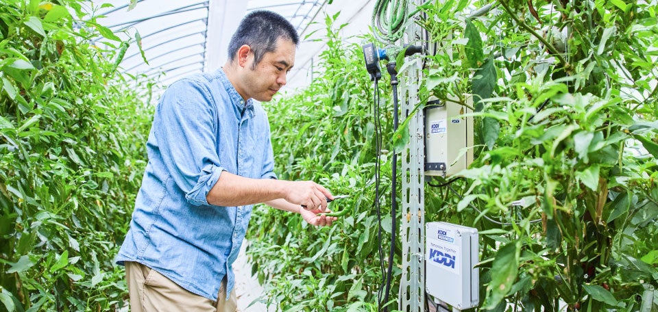 KDDIは2018年より京都府舞鶴市と地域活性化を目的とした連携協定を結び、魅力ある第一次産業の創出を推し進めています。その一環として2020年3月から取り組みを開始したのが、KDDIのIoTソリューションを用いて、京野菜「万願寺甘とう」の安定生産を目指すスマート農業の事業です。